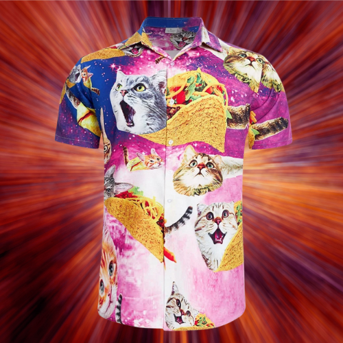 Novelty shirts in the UK are levelling up — we’re talking prints designed specifically to derail conversations. Flying burritos? Sure. Cats dressed as astronauts? Obviously. A shirt that looks like it was designed during a sugar high? Peak 2026.